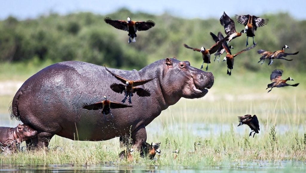Dans l’après-midi, safari dans le parc de Mahango, réputé pour sa grande diversité d’animaux : éléphants, hippopotames, antilopes, buffles et crocodiles se partagent ce territoire luxuriant, tandis que de nombreux oiseaux colorent le ciel et les berges du fleuve.