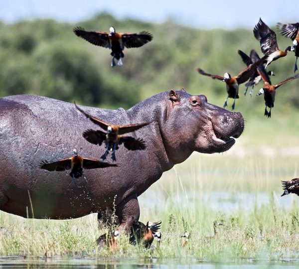 Un moment inoubliable où les éléphants viennent se baigner, les hippopotames s’ébattent dans les eaux calmes et les aigles pêcheurs survolent les berges dorées par la lumière du soir.