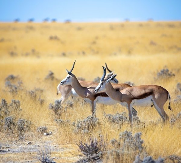 Petit déjeuner matinal au lodge, puis départ pour une journée complète de safari dans l’un des plus grands parcs animaliers d’Afrique, le Parc national d’Etosha.