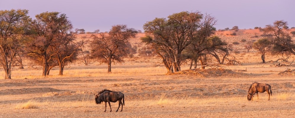 → Levez-vous à l’aube pour gravir la mythique dune 45 et admirer le lever du soleil sur les sables rouges. Découvrez ensuite Deadvlei et ses arbres pétrifiés figés dans le temps, puis visitez le canyon de Sesriem en fin de journée.Safari dans le désert du Kalahari